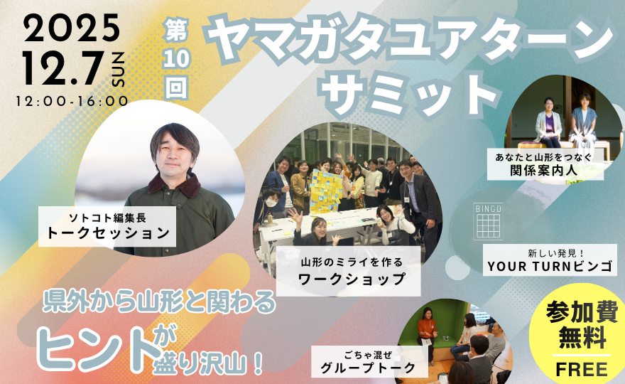 2025年12月7日(日)にも、県外から山形と関わるヒントが盛りだくさんのヤマガタユアターンサミットを開催します。総勢10人のゲストとの「山形の未来をつくるワークショップ」や「ソトコト編集長のトークセッション」「ごちゃまぜグループトーク」「関係案内所」など、あなたの「次のアクションのきっかけ」をたくさん用意してお待ちしています!スパークリングワインの販売(予定)、ビンゴ企画もあるので、楽しみながらご参加ください。https://mirailab.info/event/49237