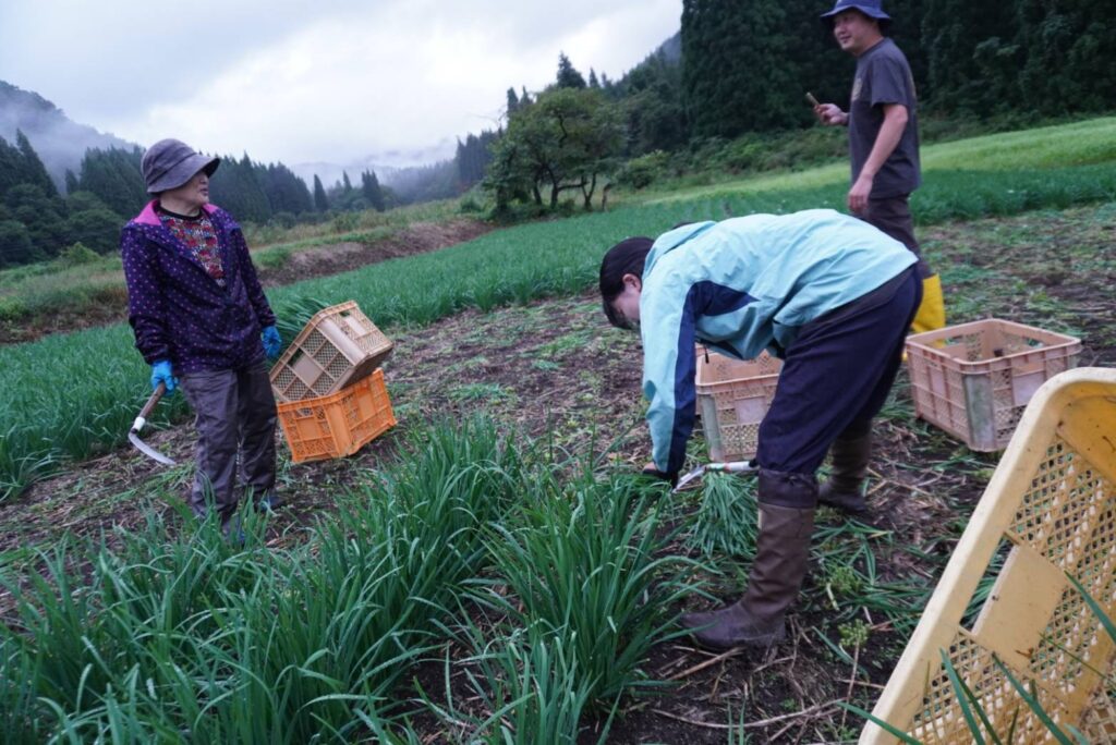 2日目は早朝6時から、希望者が町内の農家さんのニラ畑で収穫体験。朝の清々しい空気の中、金山の一次産業に直接触れる貴重な機会となりました。