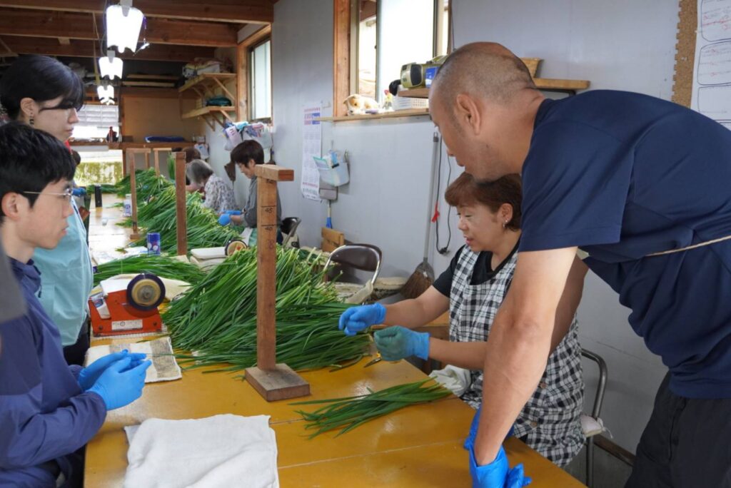 その後、ニラの選別・パック詰め体験を実施。参加者からは「普段見れないものに参加、体験出来るのは社会科見学のようでとても面白い。作業を教えてくださった地元のお母さんの指導が素晴らしく、作業の意味をより深く理解できた」との声が。希望者には収穫したニラがプレゼントされ、自宅まで郵送する手配も行われました。