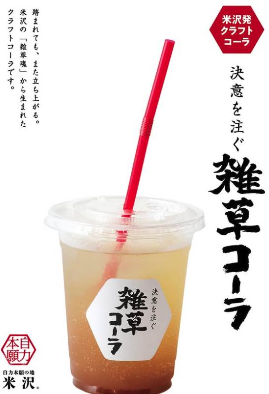 米沢人に受け継がれる「困難に陥っても立ちあがる雑草魂」をコンセプトに作られた『雑草コーラ』。